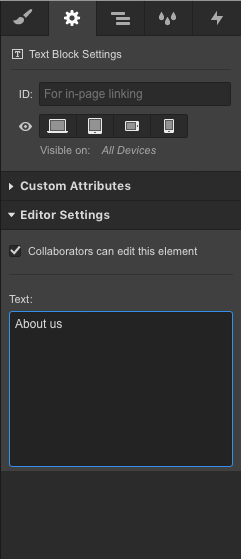 How about a text input field at the settings panel (D), were you can edit the text of a text block, paragraph, headline, richtext without the need that the element is visible at the designers view.